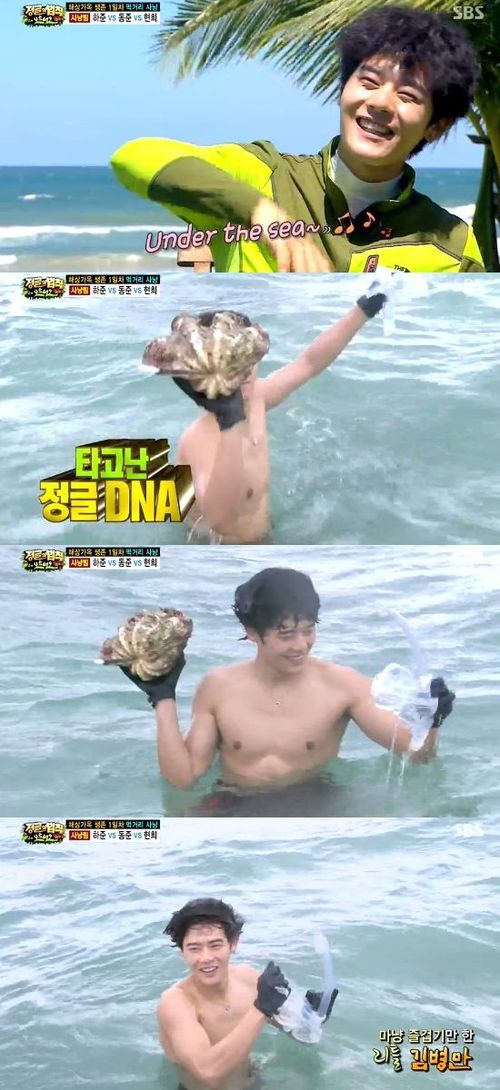 동준은 21일 오후 방송된 SBS 예능프로그램 '정글의 법칙 in 보르네오'에서 식량을 구하기 위해 바다로 뛰어들었다. 그는 서툴었지만 김병만을 따라다니며 대왕조개 잡기의 전문가로 거듭났다.