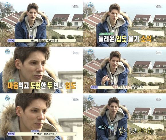 그는 이날 독도 입도를 시도했지만 거센 풍랑 탓에 입도는 불가능했다. 이에 그는 "독도 입도가 불가능하다는 소식을 듣고 기분이 확 다운됐다"며 "3년 전에도 실망이 컸었다. 눈 앞에 독도를 두고 못 들어간다는 것이 아쉬웠다. 내일은 입도할 수 있었으면 좋겠다"고 말했다.