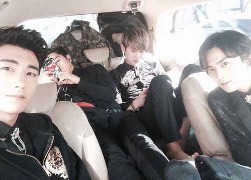 그룹 제국의아이들 멤버 박형식이 동료들과 차 안에서 사진을 찍었다.