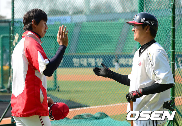 경기에 앞서 KIA 이대형이 LG 이진영과 인사를 나누고 있다.