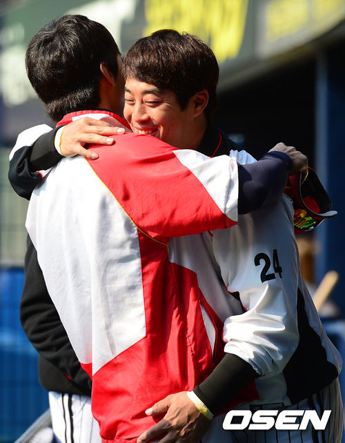 경기에 앞서 KIA 이대형이 LG 정의윤과 인사를 나누고 있다.