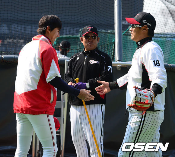 경기에 앞서 KIA 이대형이 LG 이동현과 인사를 나누고 있다.