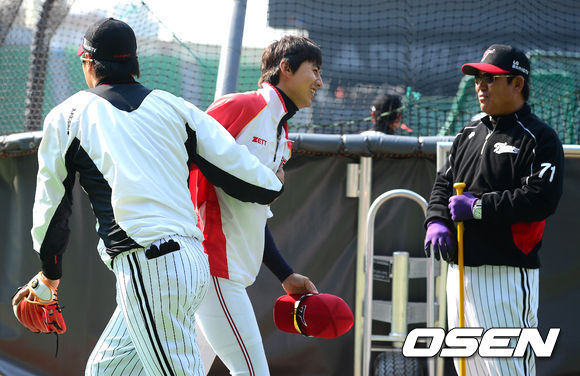 경기에 앞서 KIA 이대형이 LG 이동현과 인사를 나누고 있다.