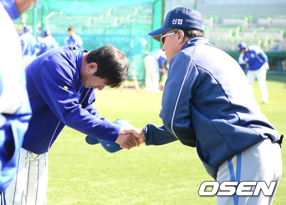 22일 오후 대구구장에서 열리는 '2014 프로야구 시범경기' 삼성 라이온즈 대 NC 다이노스의 경기를 앞두고, 삼성 류중일 감독과 NC 김경문 감독이 인사를 나누고 있다.