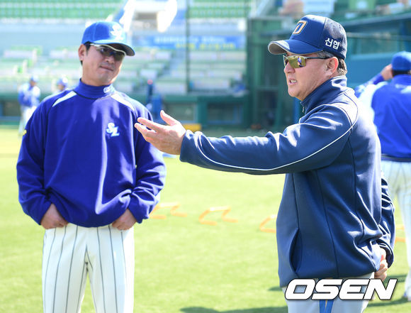 22일 오후 대구구장에서 열리는 '2014 프로야구 시범경기' 삼성 라이온즈 대 NC 다이노스의 경기를 앞두고, 삼성 류중일 감독과 NC 김경문 감독이 인사를 나누고 있다.