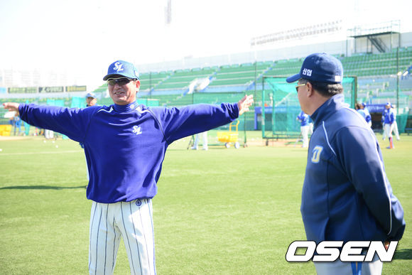 22일 오후 대구구장에서 열리는 '2014 프로야구 시범경기' 삼성 라이온즈 대 NC 다이노스의 경기를 앞두고, 삼성 류중일 감독과 NC 김경문 감독이 인사를 나누고 있다.
