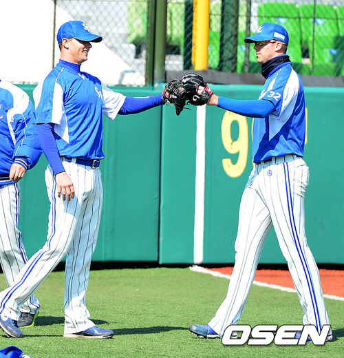 22일 오후 대구구장에서 열리는 '2014 프로야구 시범경기' 삼성 라이온즈 대 NC 다이노스의 경기를 앞두고, 삼성 외국인 투수 밴덴헐크와 마틴이 외야 캐치볼 훈련을 마치고 인사를 나누고 있다.