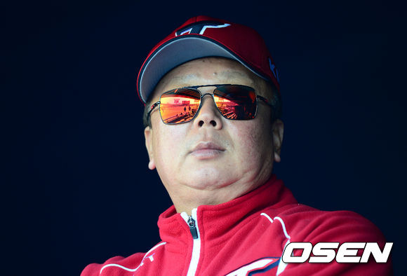 경기에 앞서 KIA 선동렬 감독이 더그아웃에서 그라운드를 바라보고 있다.