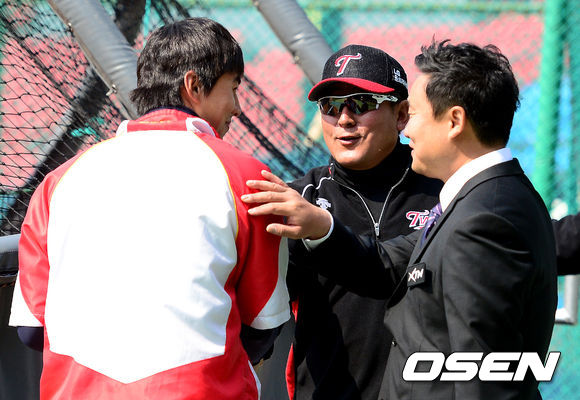 경기에 앞서 KIA 이대형이 LG 김기태 감독과 인사를 나누고 있다.