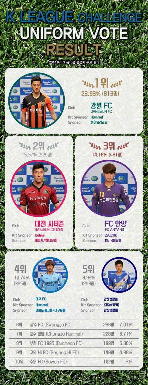 ■ 현대오일뱅크 K리그 챌린지 2014 10개 구단 유니폼 팬투표 결과(총 3397명 참여)