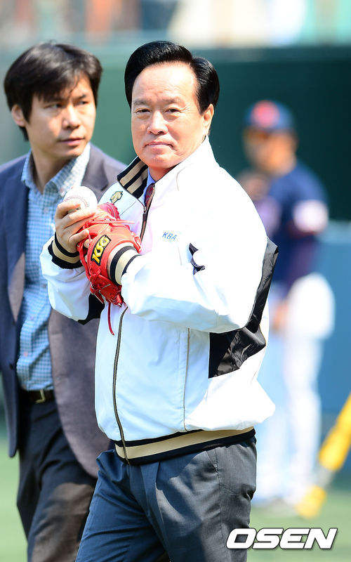 22일 오후 서울 목동구장에서 열린 '2014 고교야구 주말리그' 성남고와 배재고의 경기에 앞서 이병석 대한야구협회장이 시구를 하기위해 그라운드로 나서고 있다.