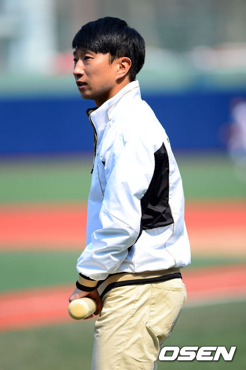22일 오후 서울 목동구장에서 열린 '2014 고교야구 주말리그' 성남고와 배재고의 경기에 앞서 스피드 스케이팅선수 이규혁이 시타를 위해 타석에 들어서고 있다.