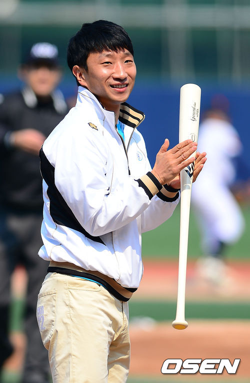 22일 오후 서울 목동구장에서 열린 '2014 고교야구 주말리그' 성남고와 배재고의 경기에 앞서 스피드 스케이팅선수 이규혁이 시타를 마친 뒤 기뻐하고 있다.