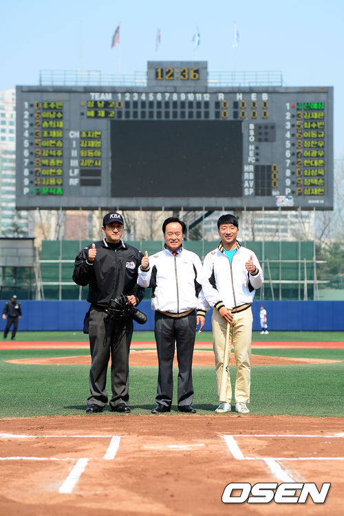 22일 오후 서울 목동구장에서 열린 '2014 고교야구 주말리그' 성남고와 배재고의 경기에 앞서 이병석 대한야구협회장과 이규혁이 포토타임을 갖고 있다.