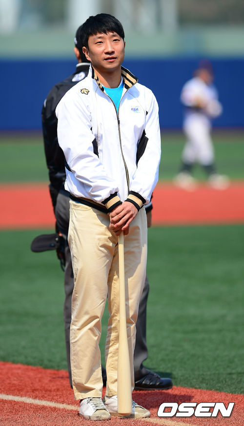 22일 오후 서울 목동구장에서 열린 '2014 고교야구 주말리그' 성남고와 배재고의 경기에 앞서 스피드 스케이팅 이규혁이 시타를 하고 있다.