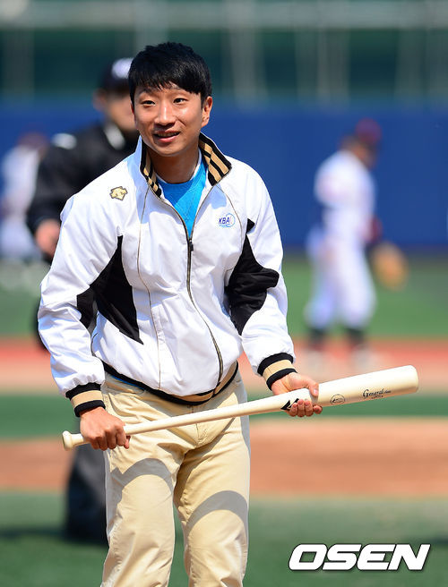 22일 오후 서울 목동구장에서 열린 '2014 고교야구 주말리그' 성남고와 배재고의 경기에 앞서 스피드 스케이팅 이규혁이 시타를 하고 있다.