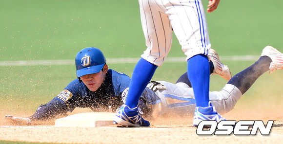 1회초 NC 공격 선두타자로 나선 박민우가 우익선상 3루타를 날리고 3루에 슬라이딩 해 세이프 되고 있다.