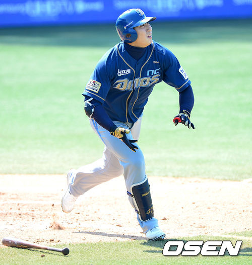 2회초 NC 공격 무사 1루 상황 나성범이 우월 투런포를 날리고 타구를 바라보고 있다.