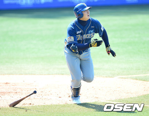 2회초 NC 공격 무사 1루 상황 나성범이 우월 투런포를 날리고 타구를 바라보고 있다.