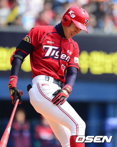 2회초 2사에서 KIA 이대형이 LG 선발 우규민의 투구에 맞으며 미소짓고 있다.