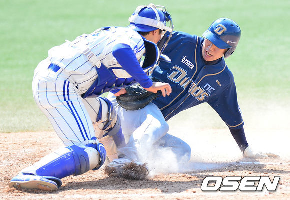 2회초 NC 공격 1사 1, 3루 상황 손시헌의 좌익수 희생플라이 때 3루 주자 모창민이 홈으로 쇄도해 삼성 포수 이흥련의 태그를 피해 세이프되고 있다.