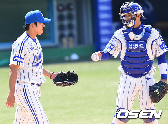 2회초 NC 공격 2사 1, 2루 상황 이종욱에게 1타점 적시타를 허용한 삼성 선발 윤성환이 포수 이흥련으로부터 공을 건네받으며 아쉬워하고 있다.