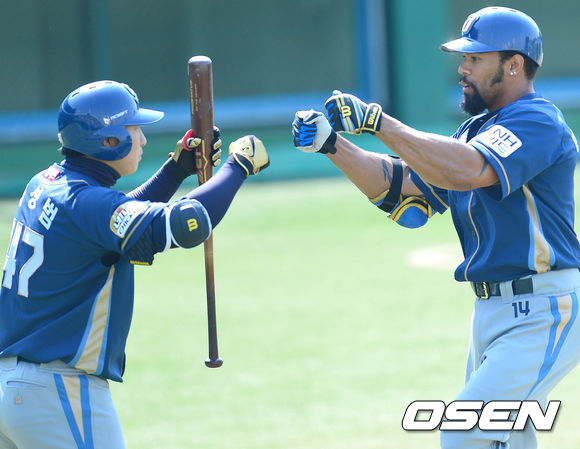 3회초 NC 공격 선두타자로 나선 테임즈가 우월 솔로포를 날리고 나성범과 인사를 나누고 있다.