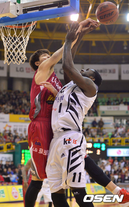 22일 오후 경남 창원시 창원실내체육관서 열린 '2013-2014 KB국민카드 프로농구' 4강 플레이오프 1차전 창원 LG와 부산 KT의 경기, 1쿼터 LG 김종규가 KT 파틸로를 상대로 슛블록을 성공시키고 있다.