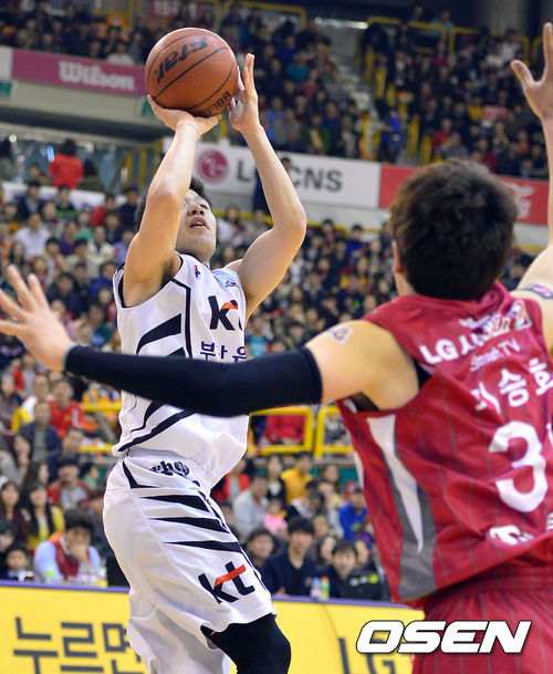 22일 오후 경남 창원시 창원실내체육관서 열린 '2013-2014 KB국민카드 프로농구' 4강 플레이오프 1차전 창원 LG와 부산 KT의 경기, 1쿼터 KT 조성민이 미들슛을 시도하고 있다.
