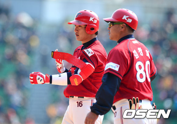 5회초 1사 3루에서 KIA 김주찬이 선제 1타점 우전 적시타를 날리고 기뻐하고 있다.