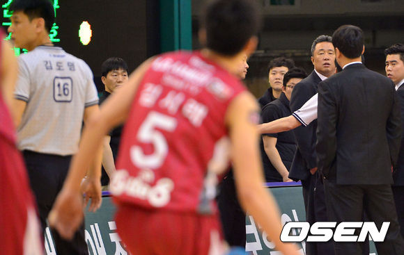 22일 오후 경남 창원시 창원실내체육관서 열린 '2013-2014 KB국민카드 프로농구' 4강 플레이오프 1차전 창원 LG와 부산 KT의 경기, 1쿼터 KT 전창진 감독이 김도명 주심을 밀며 강하게 항의하며 퇴장조치를 받았다. 전창진 감독이 김도명 주심을 바라보고 있다,