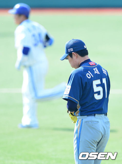 5회말 삼성 공격 2사 주자없는 상황 최형우에게 우중월 솔로포를 허용한 NC 선발 이재학이 아쉬워하고 있다.