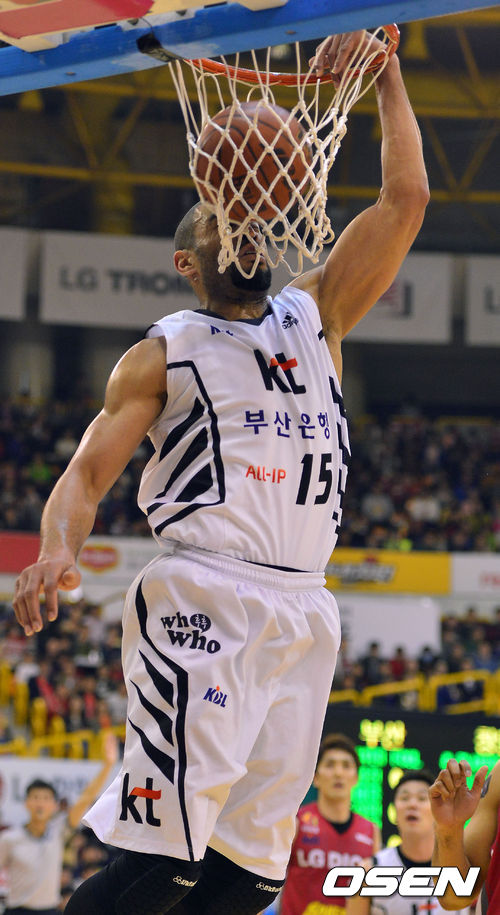 22일 오후 경남 창원시 창원실내체육관서 열린 '2013-2014 KB국민카드 프로농구' 4강 플레이오프 1차전 창원 LG와 부산 KT의 경기, 2쿼터 KT 클라크가 덩크슛을 성공시키고 있다.