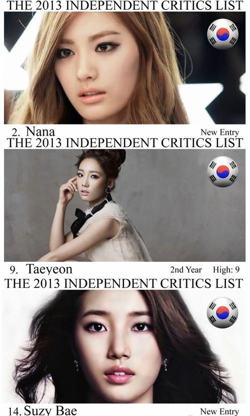1위에는 프랑스의 마리옹 꼬띠아르가 올랐으며 그 외에도 미국의 클레이 모레츠, 카밀라 벨, 영국의 엠마 왓슨 등이 상위권에 자리했다. 한국인 중에는 나나 외에도 9위에 소녀시대 태연, 14위에 미쓰에이 수지가 이름을 올려 눈길을 끌고 있다.