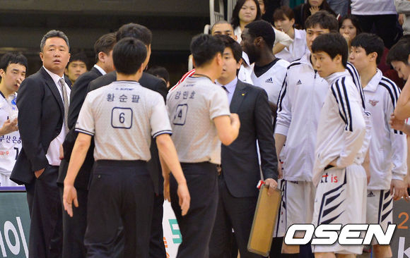 22일 오후 경남 창원시 창원실내체육관서 열린 '2013-2014 KB국민카드 프로농구' 4강 플레이오프 1차전 창원 LG와 부산 KT의 경기, 1쿼터 퇴장당한 KT 전창진 감독이 쉽게 코트를 떠나지 못하고 있다.