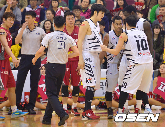 22일 오후 경남 창원시 창원실내체육관서 열린 '2013-2014 KB국민카드 프로농구' 4강 플레이오프 1차전 창원 LG와 부산 KT의 경기,3쿼터종료직전 조성민이 동료들을 불러 작전을 이야기하고 있다.