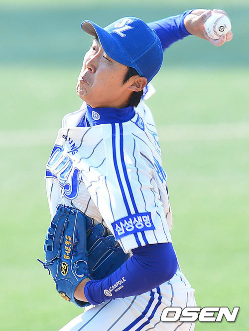 8회초 NC 공격 마운드에 오른 삼성 투수 배영수가 힘차게 공을 뿌리고 있다.