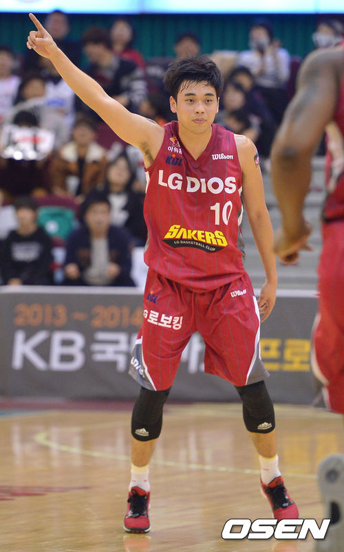 22일 오후 경남 창원시 창원실내체육관서 열린 '2013-2014 KB국민카드 프로농구' 4강 플레이오프 1차전 창원 LG와 부산 KT의 경기,4쿼터 LG 박래훈이 3점슛을 성공한후 환호하고 있다
