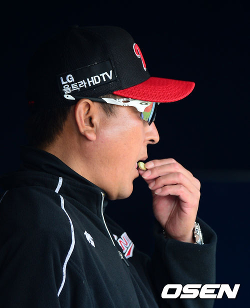 LG 김기태 감독이 피스타치오를 먹으며 경기를 지켜보고 있다.