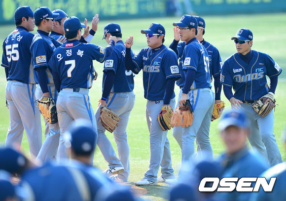 경기 종료 직후 NC 선수들이 마운드에서 하이파이브를 나누고 있다./dreamer@osen.co.kr