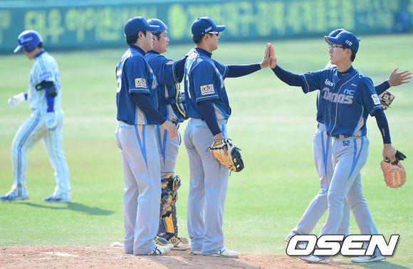 경기 종료 직후 NC 선수들이 마운드에서 하이파이브를 나누고 있다./dreamer@osen.co.kr