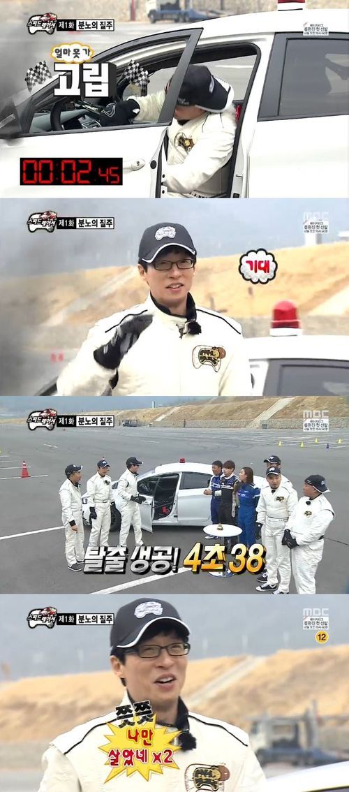 유재석은 22일 오후 방송된 MBC 예능프로그램 '무한도전'에서 멤버들과 경주용 차에서 탈출하는 게임을 하던 중 4초 38만에 탈출에 성공 유일하게 게임에서 성공했다.