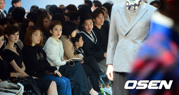 22일 오후 서울 동대문 디자인 플라자에서 열린 '2014 F/W 서울패션위크' 장광효 컬렉션에 참석한 김유리, 함은정, 김형규, 김지훈이 패션쇼를 바라보고 있다.