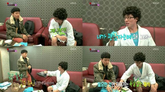 유재석은 22일 오후 방송된 KBS 2TV 예능프로그램 '인간의 조건'에서 물물교환을 하려는 허경환에게 신고 있던 새 신발을 흔쾌히 줘 보는 이들의 시선을 사로잡았다.