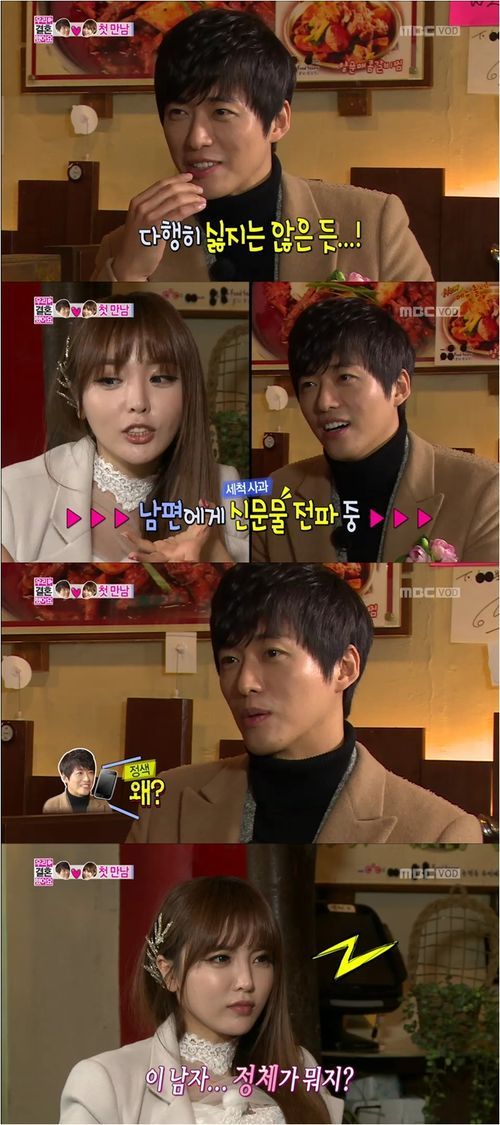 남궁민은 일단 이성을 볼 때 ‘척하는 여자’는 싫다고 했다. 더불어 과한 애교를 발산하는 홍진영에게 “귀여운 척 하는 것이 아니냐”고 직설적으로 물어봤다. 홍진영은 “누구나 나를 보면 그런 생각을 하지만 초면에 물어보지는 않는다”고 당황해 했다.