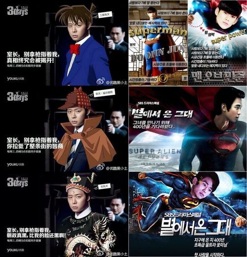 ‘쓰리데이즈’ 전작 ‘별그대’의 김수현도 다양하게 패러디 돼 눈길을 끌었다. ‘별그대’ 홈페이지의 UCC 포스터 콘테스트 코너에 다양한 김수현의 슈퍼맨 패러디물이 게재돼 눈길을 끌었다.