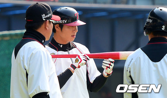 23일 오전 서울 잠실구장에서 열리는 '2014 프로야구 시범경기' LG 트윈스와 KIA 타이거즈의 경기에 앞서 LG 권용관이 김기태 감독의 펑고배트를 확인하고 있다.