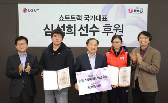 LG유플러스가 21일 남대문로 사옥에서 쇼트트랙 국가대표 심석희 선수와 가족을 초청, 심석희 선수 후원 증서 및 심 선수 오빠인 심명석 군의 장학 증서 전달식을 가졌다.