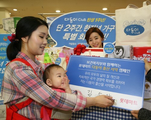 롯데마트는 23일 현재 자녀가 1명인 고객이 둘째를 낳겠다고 서약하면 할인 혜택을 주는 '다둥이 출산 서약' 캠페인에 약 4만5000 가구가 참여했다고 공지했다.