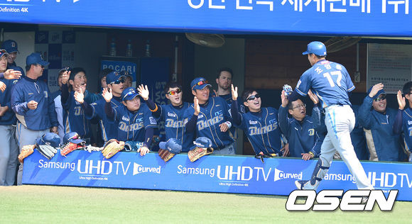 2회초 NC 공격 2사 1루 상황 조영훈이 선제 우월 투런포를 날리고 홈을 밟은 뒤 더그아웃 동료들과 인사를 나누고 있다.